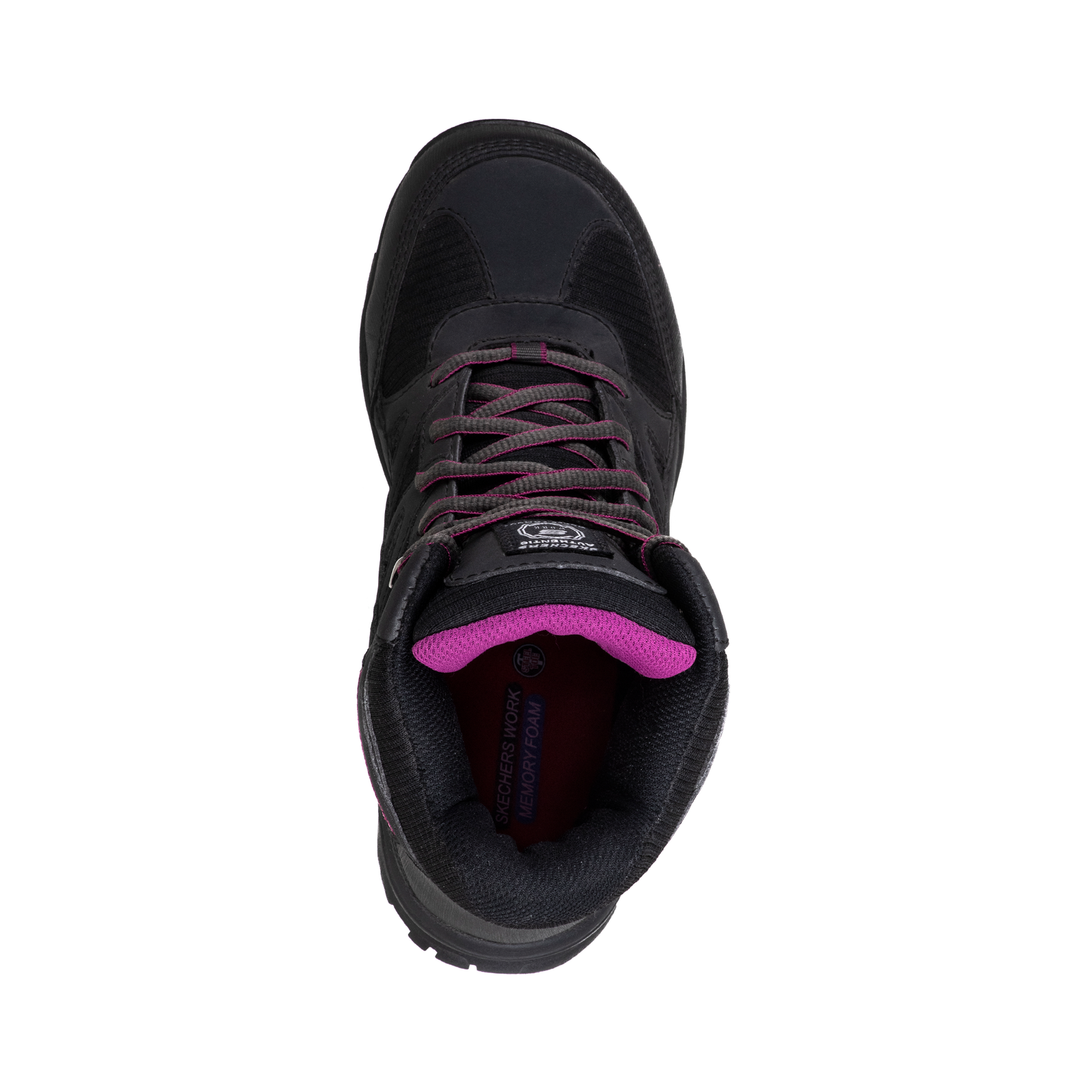 Nuestro calzado de seguridad Skechers Pomeria de color negro con detalles en tono lila.
