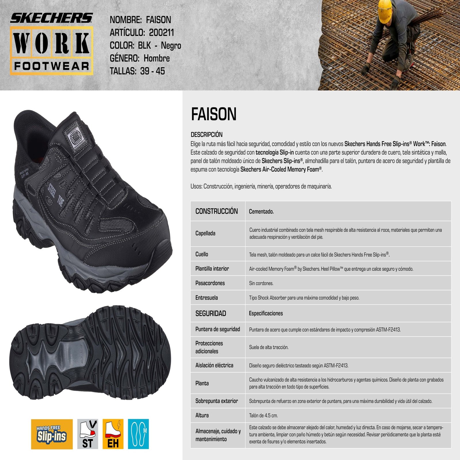 - Puntera: Acero, cumple estandar de impacto y compresión ASTM-F2413.
