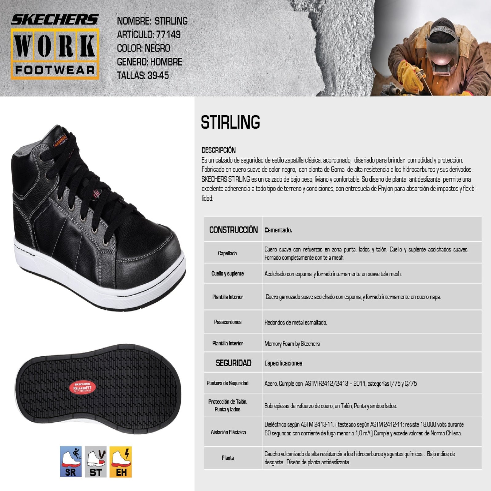 El modelo Skechers Stirling, es un calzado de seguridad corte alto, de estilo zapatilla clásica, acordonado diseñado para brindar comodidad y protección.