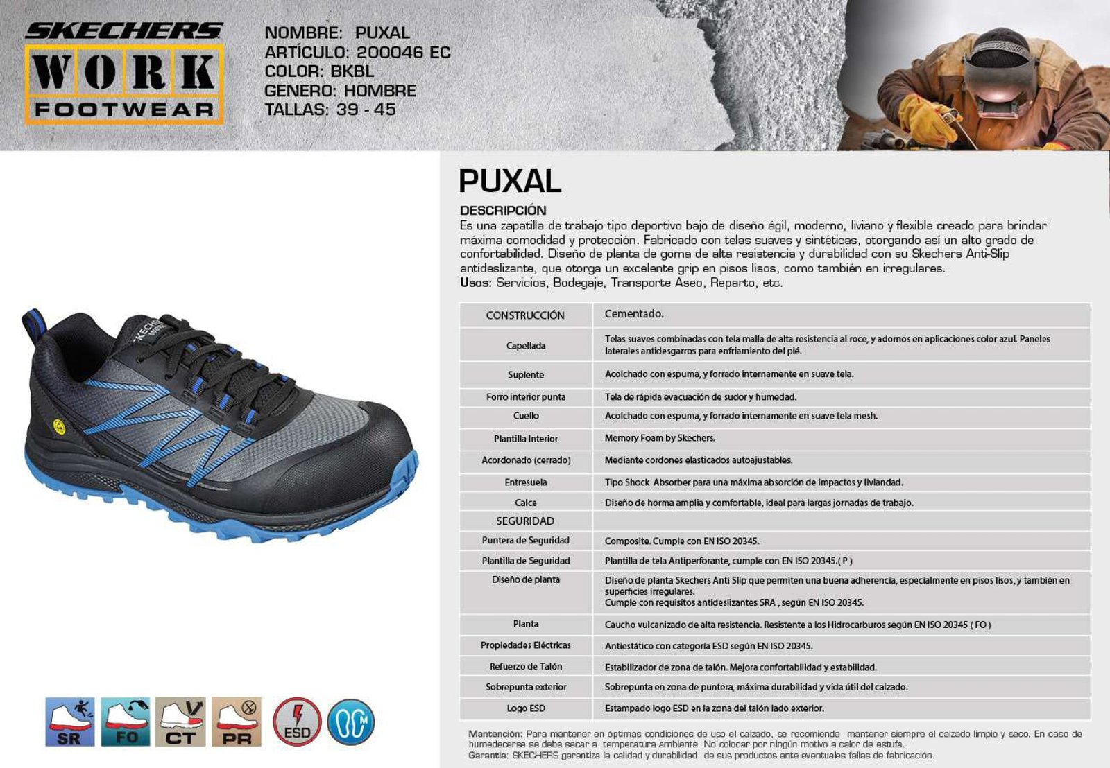 Zapatilla de seguridad Skechers Puxal es un calzado tipo deportivo bajo, de diseño ágil, moderno, liviano y flexible creado para brindar máxima comodidad y protección. Fabricado con telas suaves y sintéticas otorgando así un alto grado de confortabilidad.